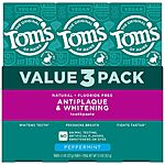 Includes three (3) 4.5 oz Tom's of Maine Antiplaque and Whitening Fluoride Free Toothpaste tubes