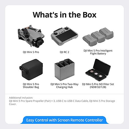 Includes DJI Mini 5 Pro, DJI RC 2, three batteries, spare propellers, a charging hub, ND filters and more for clear vision, confident flying, and beginner-friendly use. (from product page)