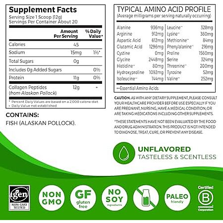 Model: Orgain Wild-Caught Marine Collagen Peptides Powder for Women & Men, Hair, Skin, Nail & Joint Support Supplement, 12g Collagen Per Serving, Pescatarian & Paleo, Non-GMO, Unflavored, Type I & III, 8.5oz