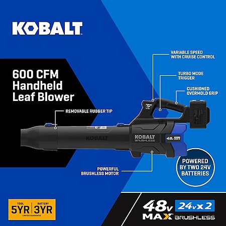 Lowe's has Kobalt 48V MAX (24Vx2) 600 CFM / 150 MPH Handheld Leaf Blower Kit, (2) 4.0Ah Batteries and Charger Included for $149. Store pickup is free.