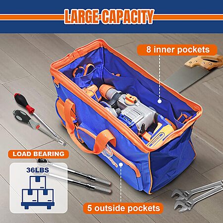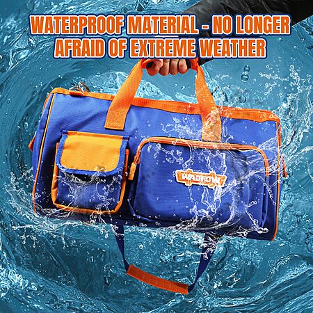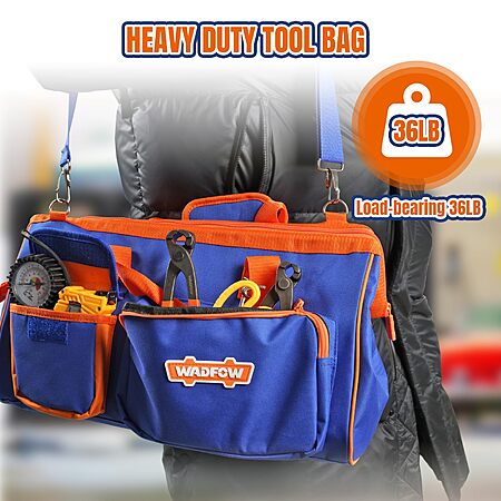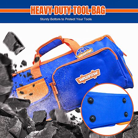 Amazon.com has WADFOW 19-inch Tool Bag, Waterproof Wide Mouth Storage Bag with Adjustable Shoulder Straps for Professional and Daily Use,Blue and Orange on sale for $15.33.