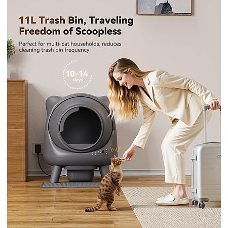 - Self-Cleaning & Zero Scooping: Automatically cleans within 2 minutes after your cat exits, separating waste and depositing it into a trash bin. No scooping for up to 15 days with a large 11L trash bin.