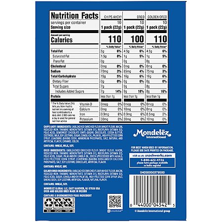 - This Sweet Treats Cookie Variety Pack includes OREO Original cookies, OREO Golden cookies and CHIPS AHOY! chocolate chip cookies in convenient snack packs for freshness and perfect portions. OREO cookies have the same original creme filling, and OREO Golden cookies offer a fun, vanilla take on the classic sandwich cookies. CHIPS AHOY! chocolate chip cookies are filled with crunchy goodness for a sweet treat. Tuck these snack packs into your lunch for a fun dessert, or reach for these snack size cookies when you're ready to unwind from the day. They also make great holiday favors, stocking stuffers, Easter basket fillers, Halloween treats, school snacks, snack variety packs for adults and sweet snacks for the team after the big game. Each individually wrapped cookie pack includes two cookies, just the right amount to satisfy your sweet tooth. This cookie pack of variety snacks includes 30 individual snacks for easy storage and convenient transport.