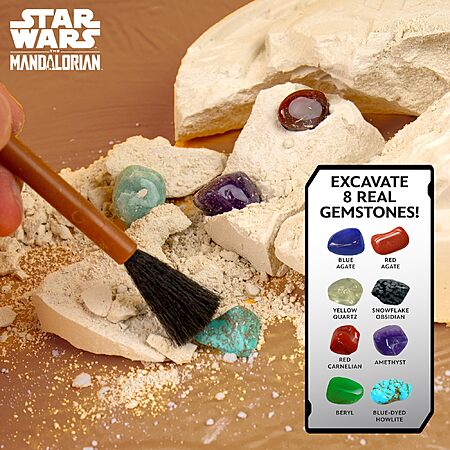 - REVEAL 8 REAL GEMSTONES: Imagine digging into The Armorer's helmet to discover blue agate, yellow quartz, snowflake obsidian, red carnelian, amethyst, beryl, red agate, and blue howlite — the ultimate Star Wars excavation experience!
