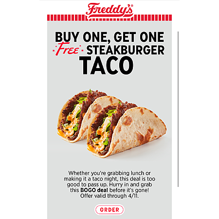 Offer valid through 4/11/26 only. Must add 2 Steakburger Tacos and offer to cart for offer to apply then checkout. Offer only available for existing Fredheads. Offers and rewards may vary by FredHead. Check your Freddy's app wallet for the most up-to-date personalized deals. Offer valid only for orders placed through the Freddy's App, online, or at participating locations (excluding airports, stadiums, and college campus locations). Gift card purchases do not qualify for loyalty points.
