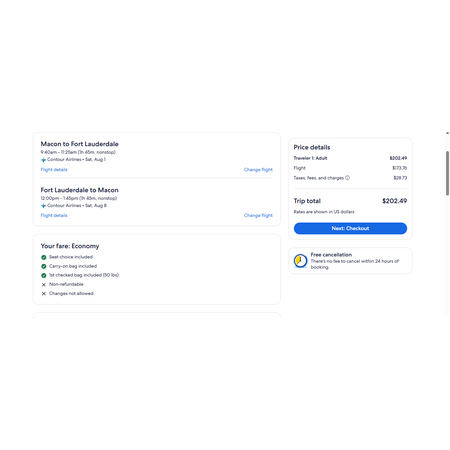 Contour Airlines, a regional premium low-fare air carrier (offering free checked bag and complimentary refreshment service) have airfares travelling to and from Macon GA (MCN) and Ft Lauderdale (FLL) for $203, nonstop. These airfares are economy fares that include a carry-on bag and a free checked bag. Travelers can also book connections with Contour's interline partners; Alaska, American, JetBlue, and United Airlines.