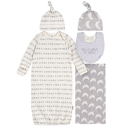 Set Includes: Includes gown, two caps (or cap + headband), bib, & swaddle blanket. Made of 100% cotton, except the blanket which is polyester/spandex.