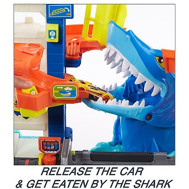 A massive shark lurks beneath the Hot Wheels City parking garage, attacking and devouring unsuspecting vehicles