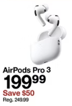 Beginning April 12th, Target [target.com] will have Apple AirPods Pro 3 Wireless Active Noise Cancelling Earbuds for $199.99. Shipping is free.