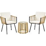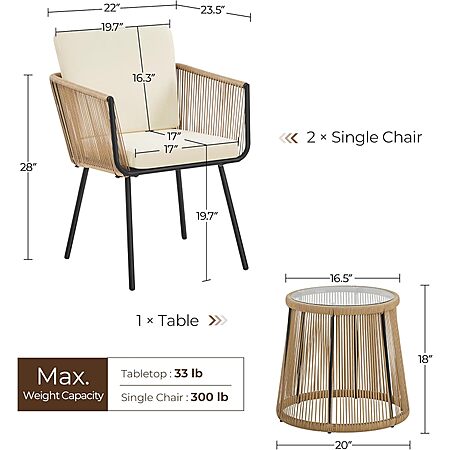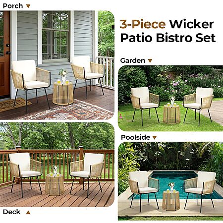 About this item- 3-Piece Bistro Set: This outdoor wicker bistro set includes two comfy armchairs with cushions and pillows, and a round table for drinks, snacks, or decor, ideal for gardens, patios, or poolside relaxation