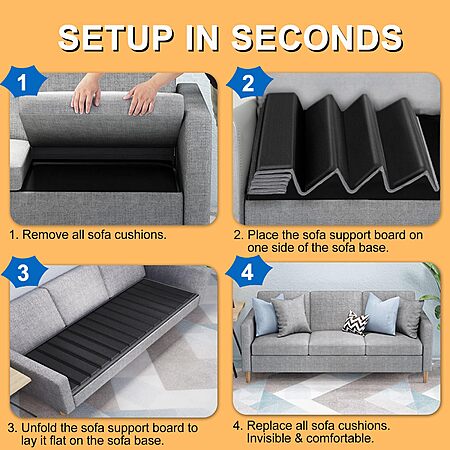 - INSTALL IN SECONDS - The easiest way to fix sagging couch cushions—no tools required. Simply remove cushions, place the under couch cushion support on the frame, and put cushions back. Instantly restore firmness and comfort. Backed by LAVEVE's quality warranty for lasting confidence.