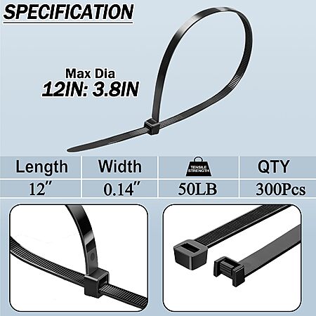 Zip Ties 12 Inch Cable Ties 300 Pack Cable Zip Ties Clear Tie Wraps $3.99