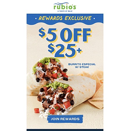 Rewards members take $5 off $25 or more before tax and gratuity. Must join rewards to recieve offer. Expires 4/13. Cannot be combined with any offers or discounts. Additional restrictions may apply, see store for details. Manager reserves all rights