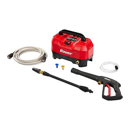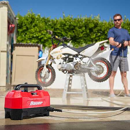The BAUER™ 1800 PSI, 1.2 GPM Portable Electric Pressure Washer is compact and lightweight with a 13 amp motor that delivers plenty of power for cleaning bikes, barbecues, patio furniture, campers, and recreational equipment. It comes with 3 quick connect nozzles for soaping, 15° wide-area cleaning, and a high-power turbo nozzle for heavy duty cleaning. Onboard storage keeps nozzles secure until you need them.