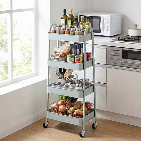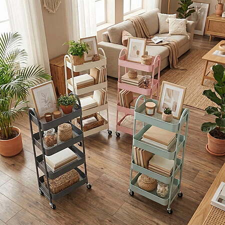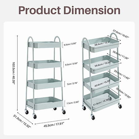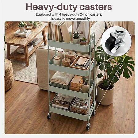 | Product Description: | This 3/4-tier utility rolling cart features a sturdy metal frame and lockable caster wheels for smooth, secure mobility. Slim design fits narrow spaces like between furniture or in tight bathrooms. Perfect for storing toiletries, cleaning supplies, snacks, or office essentials—ideal for living rooms, bathrooms, kitchens, dorms, or laundry areas. Keeps everything organized and within reach! 【Multi-purpose & Fashionable】This 4-tier metal rolling storage cart not only provide large storage space. And simple color matching, choose the right color according to the style of your room. Transform your clutter into organized bliss. It helps saving, optimization and using space. It makes home organized and meets all kinds of needs at home. 【Breathable Mesh Hollow】This storage trolley bottom adopts a mesh hollow, bid farewell to the residue of stagnant water during use, and keep things dry at all times, effectively prevent or slow spoilage. 【High-quality Metal Material】This rolling cart is made of high-grade metal material. Sturdy frame and rust-resistant process make it outlasting flimsy plastic alternatives. Durable poles will not deform easily, smooth surface prevent scratching. 【Easy Assembly】This storage shelf cart installation is very simple, equipped with clear and easy-to-understand installation instructions, no additional installation tools are required, and you can have a perfect rolling storage cart within 15 minutes. 【Movable & Lockable】This mesh utility storage cart contains 4 smooth-rolling wheels that can be rotated 360 degrees, and 2 of these wheels come with locks, ensuring stability when you need it, and an move and brake freely in any field. You can flexibly use it for storage in office, bathroom, laundry room and narrow places,etc. |