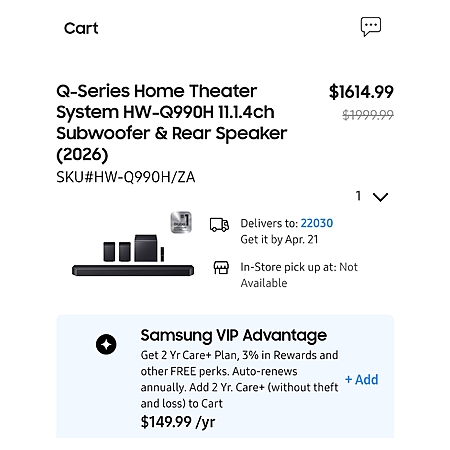 Samsung EPP/EDU: (2026) HW-Q990H Q-Series 11.1.4ch Wireless Dolby ATMOS Soundbar $1615