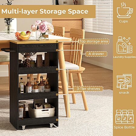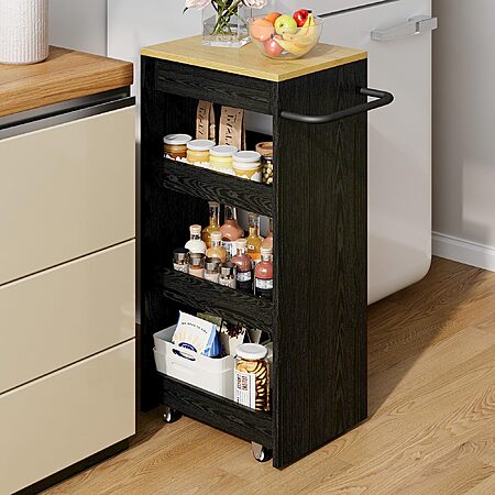 Amazon.com has IRONCK Wood Storage Cart 15.8" W, 4 Tier Rolling Kitchen Cart on Wheels, Slide Out Utility Cart, Organizer Trolley with Handle, Drawer for Kitchen, Laundry, Bathroom, Black on sale for $39.99.