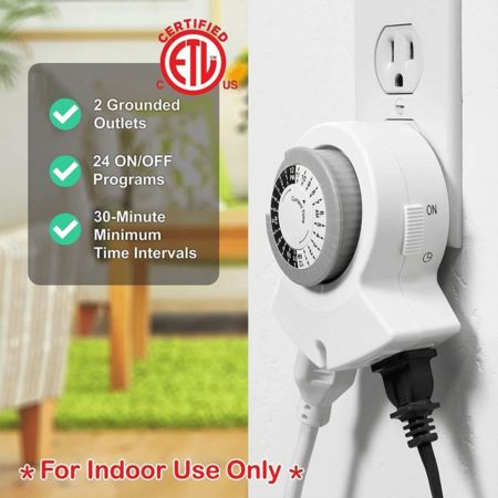 • Two mechanical timers with 30-minute intervals and up to 48 on/off settings per day