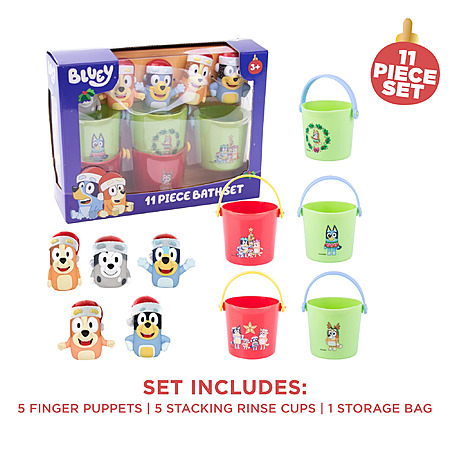 Bath time just got a lot more fun for your little one with the Bluey 11 Piece Holiday Bath Set! This Bath Set includes a variety of bath toys for a fun and interactive way to turn bath time into a fun adventure! The Bluey 11 Piece Holiday Bath Set comes with 5 Finger Puppets, 5 Stacking Rinse Cups and 1 mesh storage bag with suction cups. Perfectly sized for little hands, all items included are excellent for toddlers to play with during their bath. While kids enjoy playtime in the bath with the Finger Puppets, parents can use the fun and practical Rinse Cups to rinse soap and shampoo from their children. But when it’s time for some fun, kids can simply fill these rinse cups up and watch as water drains out whichever way they choose. When bath time is over, all toys in the set can simply be wiped down with mild soap and water and stored in the reusable mesh storage bag. Given the compact size of the items in the set, these also make for great holiday gifts and spectacular stocking stuffers! INCLUDES: 5 Finger Puppets, 5 Stacking Rinse Cups and 1 mesh storage bag INCLUDES: 5 Finger Puppets, 5 Stacking Rinse Cups and 1 mesh storage bag GIFT IDEA: Perfect for stocking stuffers and holiday gifting