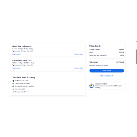 American Airlines and Expedia have round trip airfares travelling to and from New York (LGA) and Phoenix (PHX) for $227, making 1 stop both ways. These are basic economy fares. On American, you may have a personal item and a carry-on bag. There is no seat selection and no change.