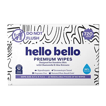 Hello Bello Premium Wipes, Designed for Sensitive Skin with Chamomile & Aloe Extracts, Playful Sketches (12 Resealable Packets = 720 Total Wipes) $23.19