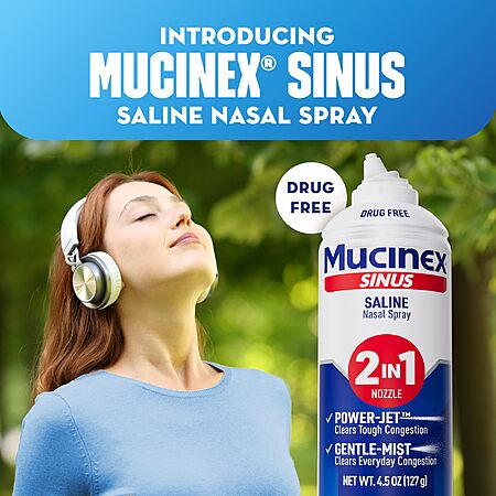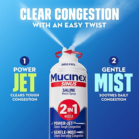 Mucinex Sinus Saline Nasal Spray & Sinus Rinse, Drug-Free, Additive Free, Non-Drowsy Nasal Irrigation with 2-in-1 Jet + Mist Spray Nozzle for Cold & Allergy Season, 4.5oz $7.4