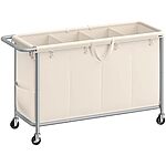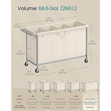 Model: SONGMICS Laundry Basket with Wheels, 4-Section Rolling Laundry Hamper, 68.6 Gallons (260 L), Removable Liner, Steel Frame with Handle, 43.3 x 15.4 x 31.9 Inches, Cream White URLS014W01
