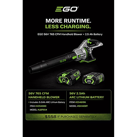 $329: EGO POWER+ 56V 765 CFM 200 MPH Handheld Blower with 5.0Ah ARC Lithium Battery and 2.5Ah ARC Lithium Battery at Lowe's