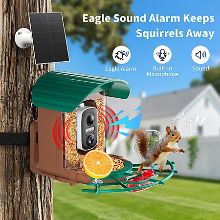 • Eagle Sound Alarm: Automatically plays eagle sound to scare away squirrels and protect bird food.