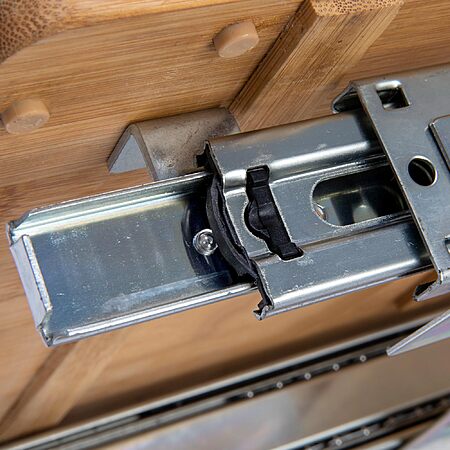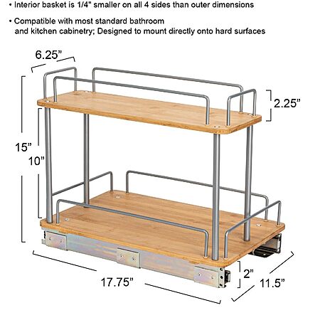 - This cleverly designed, durable powder-coated steel and natural bamboo organizer is crafted to accommodate sink pipes or taller essentials with a narrow top tier and full-sized bottom tier; Equipped with an easy-mount full-extension ball-bearing sliding base