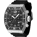 Invicta 4728 Pro Diver men's watch features a 51mm wide and 15mm thick solid stainless steel case with a grey fixed bezel and textured push-pull crown with function pushers. Invicta 4728 is powered by a precise Japanese TMI VD53 quartz chronograph movement. This stylish watch also features a shiny sunray dial with white accents silver tone luminous hands and dot and Arabic numeral hour markers along with the chronograph, 12/24-hour time and date display functions, scratch resistant mineral crystal and water resistant to 100 meters. Invicta 4728 is equipped with a 30mm wide black silicone rubber strap with a buckle clasp. Invicta 4728 men's Pro Diver chronograph watch is brand new and comes in an original gift box and is backed by a 3 years limited warranty