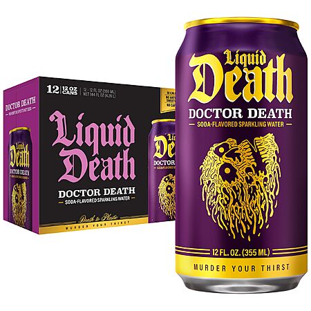 Model: Liquid Death, Doctor Death, Soda-Flavored Sparkling Water, 12-Pack (12oz Cans), Low Sugar, Huge Flavor & No Artificial Sweeteners
