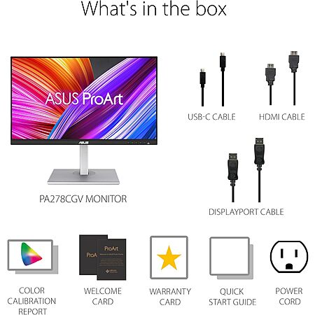 ASUS ProArt Display 27” 1440P Professional Monitor (PA278CGV) - IPS, QHD (2560 x 1440), 144Hz, 95% DCI-P3, ΔE < 2, Calman Verified, USB-C PD 90W, for $229