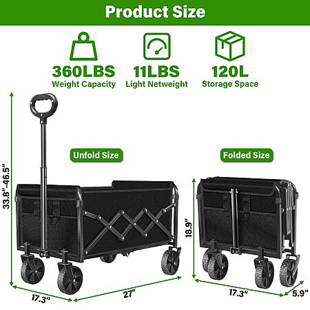 360lb Capacity Foldable Collapsible Wagon Cart w/ All-Terrain Wheels (Black) $29.10 + Free Shipping w/ Prime or on $35+