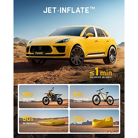 • One-touch presets for Car, Motorcycle, Bicycle, Ball, Deflate, Inflate, or Custom (no frequent nozzle switching)