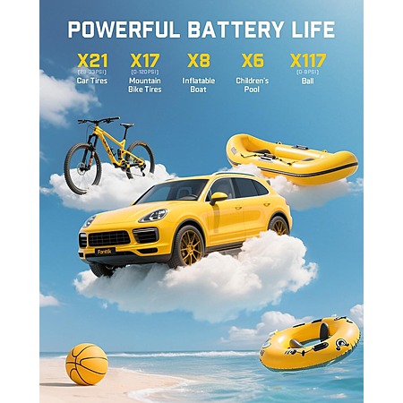 • 2-in-1 inflator + blower: inflates tires, camping gear, and pool floats; also blows away dust/debris and can vacuum-seal storage bags