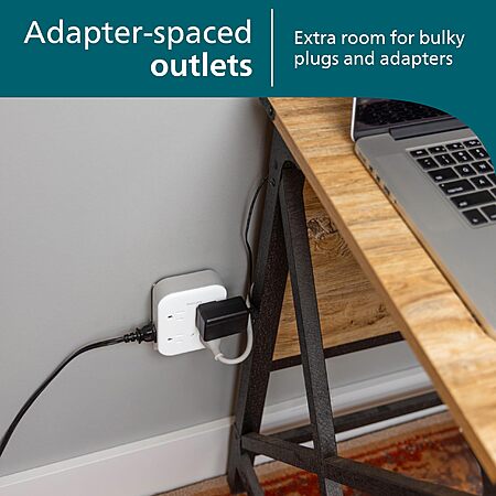 - Adapter-spaced outlets – Thoughtful design provides ample room to accommodate multiple bulky adapters and charging blocks, keeping other outlets unobstructed while side-access polarized outlets keep power cords close to the wall