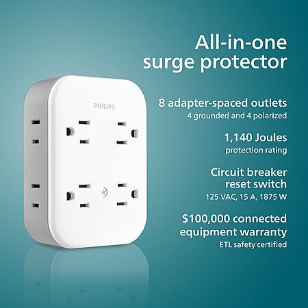 Amazon.com has Philips All-in-One Surge Tap, 4 Grounded & 4 Polarized Outlets, 1140 Joules, Adapter-Spaced Design, ETL Certified, White/Gray, SPP3993W/37 on sale for $9.99.