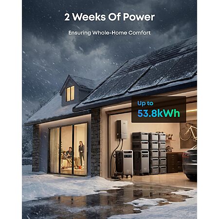 Enlarged Capacity from 3.84kWh: F3800 Plus starts with 3.84kWh, enough power for your family for one day. If that's not enough, add up to 6 batteries for 26.9kWh. Or add 12 batteries and another F3800 for weeks of power.