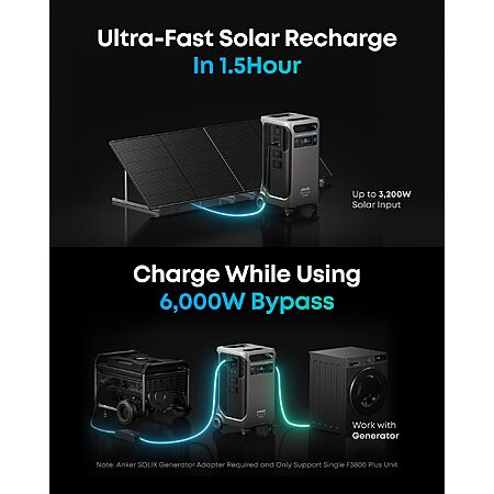 Model: Anker SOLIX F3800 Plus Portable Power Station with 400W Solar Panel, 3,840Wh, 6,000W AC Output, 120V/240V, Generators for Home Use, Works with Generator, For Power Outages, RVs, and Emergencies