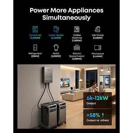 Power More Appliances Simultaneously: F3800 Plus offers a massive 6,000W output, 58% more than other portable power stations at the same capacity. For more power, pair two for up to 12,000W max AC output.