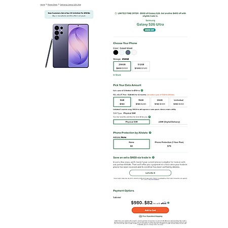 Mint Mobile is offering Samsung Galaxy S26 Ultra (Locked) 256GB Smartphone (4 Colors) + 12-Month Mint Mobile Unlimited Prepaid Plan on sale for $980 with free shipping.