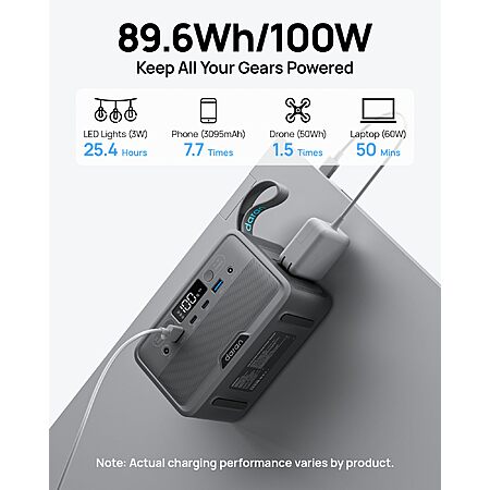 【DUAL INPUT/OUTPUT (AC + DC)】The portable power station comes with a 89.6Wh capacity LiFePO4 battery pack(not NCM) and 100W, features 7 output ports, including 2 AC sockets (100W),2 USB-C port (45W/15W), 2 USB-A port (18W/15W), and DC5521 ports (60W). The LED display can clearly show the working status and remaining power.(Please peel off the protective film on the screen after unboxing)