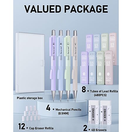 - [Exquisite Pencil Set ] You will get 4pcs 0.5mm distinctively colored mechanical pencils, 8 tubes of 0.5mm lead refills (total 480pcs), 2pcs larger premium erasers and 12pcs cap eraser refills and a plastic storage box