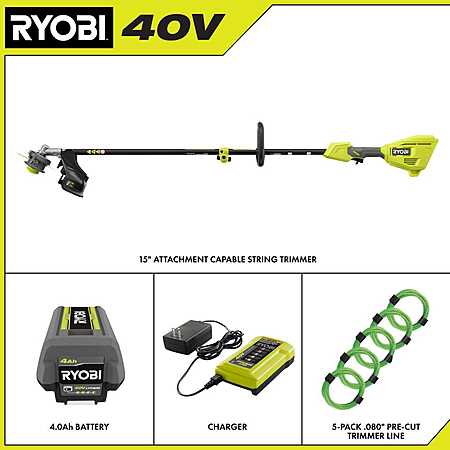 | Product Description: | The 40V 15" String Trimmer Kit delivers more power than a 25cc gas trimmer, providing a true gas replacement without the hassle of fuel. With just a pull of the trigger, enjoy up to 1 hour of runtime using the included 40V 4Ah battery. Save time, money, and space with RYOBI EXPAND-IT compatibility, allowing you to transform your trimmer into various tools for any yard task. The adjustable 13" to 15" cut swath lets you balance performance and runtime, while the variable-speed trigger offers precise control for trimming around fences, mailboxes, and flower beds. Reload your .080" line in under 60 seconds with the REEL EASY+ SPEED WINDER bump-feed head. This trimmer is part of the RYOBI 40V System, making it compatible with any 40V battery. The kit includes the 40V Power Head, Straight Shaft Trimmer Attachment, 40V 4Ah Battery, 40V Charger, Front Handle, Grass Deflector, and .080" Replacement Line, all backed by a 5-year tool warranty and 3-year battery warranty. Additionally, the RYOBI Pre-Cut Trimmer Line eliminates the hassle of measuring and cutting, providing premeasured, precut lines for fast, accurate reloads. The durable 0.080" heavy-duty spiral co-extruded line fits all bump-feed heads. |