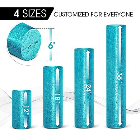 - MULTIPLE SIZES: Our yoga roller is available in four sizes 36x6 inches for full back, 24x6 inches for more versatile and easier control, 18x6 inches for smaller muscle groups, and 12x6 inches for one specific area and saving space