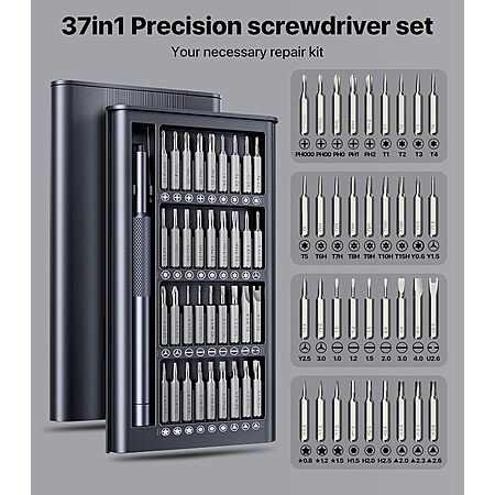 - This small screwdriver head adopts replaceable-bit design, making it more compact and comprehensive, it comes with 37 different bits (Phillips, Flat, Torx, Torx Security, Pentalobe, Hexagon, etc.).
