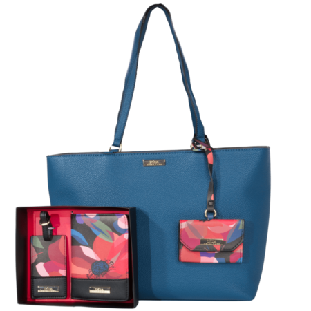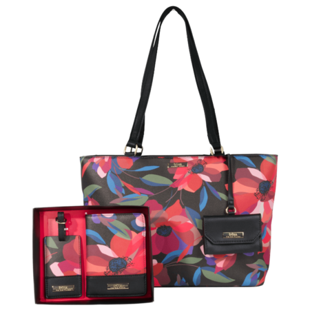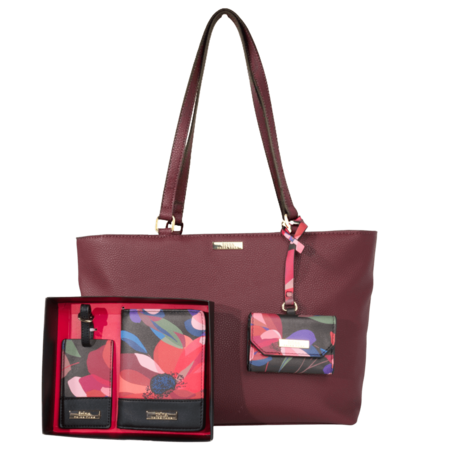 Features- Travel in style with the Trina Turk Tote with Travel Gift Set, available in Floral, Bordeaux, and Blue