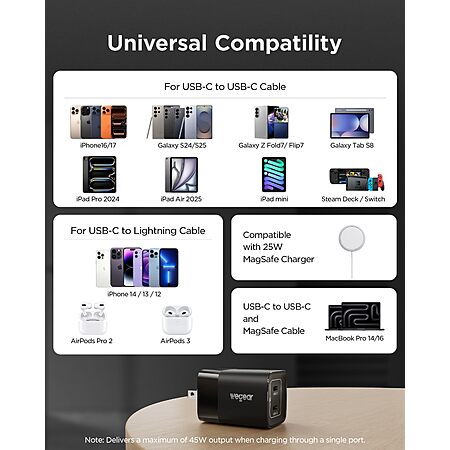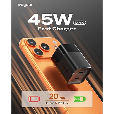 Amazon.com: wegear 45W USB C Charger, 2 Port GaN Fast Charging with PPS, Foldable Wall Charger Block for iPhone 17/16/15, iPad, Galaxy S25/S24, Pixel 10/9 (Black) : Cell Phones & Accessories