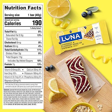 [SnS, AC] $10.24 | 15-Pack 1.69-Oz Luna Bar Gluten Free Snack Bars (Mash-Ups LemonZest + Blueberry) at Amazon